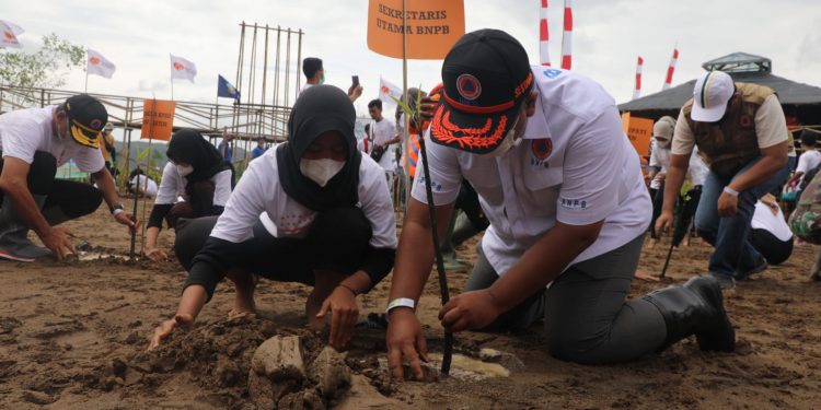 Pacitan, SatukanIndonesia. Com – Menjawab tantangan potensi ancaman tsunami di selatan Jawa, upaya mitigasi dan kesiapsiagaan berbasis masyarakat harus dilaksanakan secara berkelanjutan. Untuk itu, Badan Nasional Penanggulangan Bencana (BNPB) melalui Direktorat Kesiapsiagaan menggerakkan elemen pentahelix untuk meningkatkan kesiapsiagaan melalui kegiatan Sapa Desa Tangguh Bencana (Sapa Destana) dan penguatan mitigasi melalui penanaman 2.000 batang mangrove pada hari Minggu (28/11).
