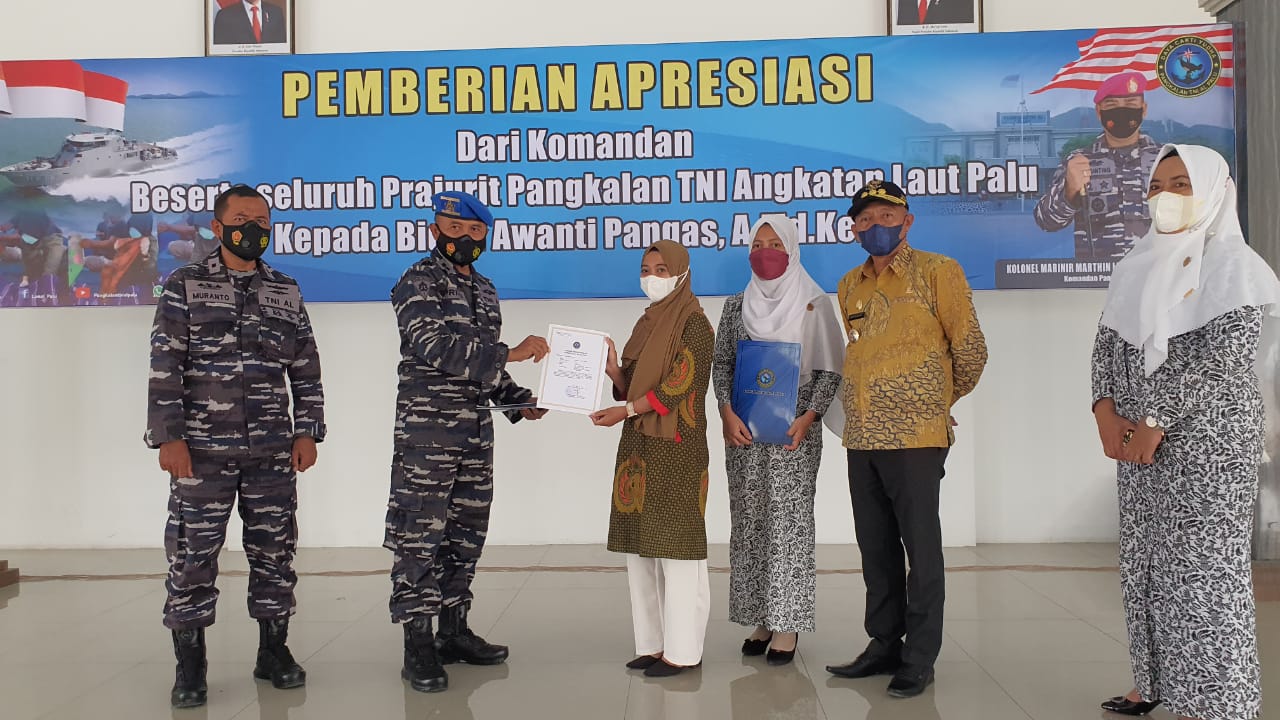 Penghargaan Komandan Pangkalan Angkatan Laut (Danlanal) Palu dalam bentuk sertifikat dan uang pembinaan diserahkan Perwira Pelaksana (Palaksa) Lanal Palu Letkol Laut (PM) Priyo Yudono, mewakili (Danlanal) Palu Kolonel Marinir Marthin Luther Ginting, kepada kedua tenaga kesehatan yang bertugas di Puskesmas Lantiobung, Kecamatan Bangkurung, Kabupaten Banggai Laut, Sulawesi Tengah bertempat di Gedung Serba Guna Lanal Palu, Jumat (30/7/2021).