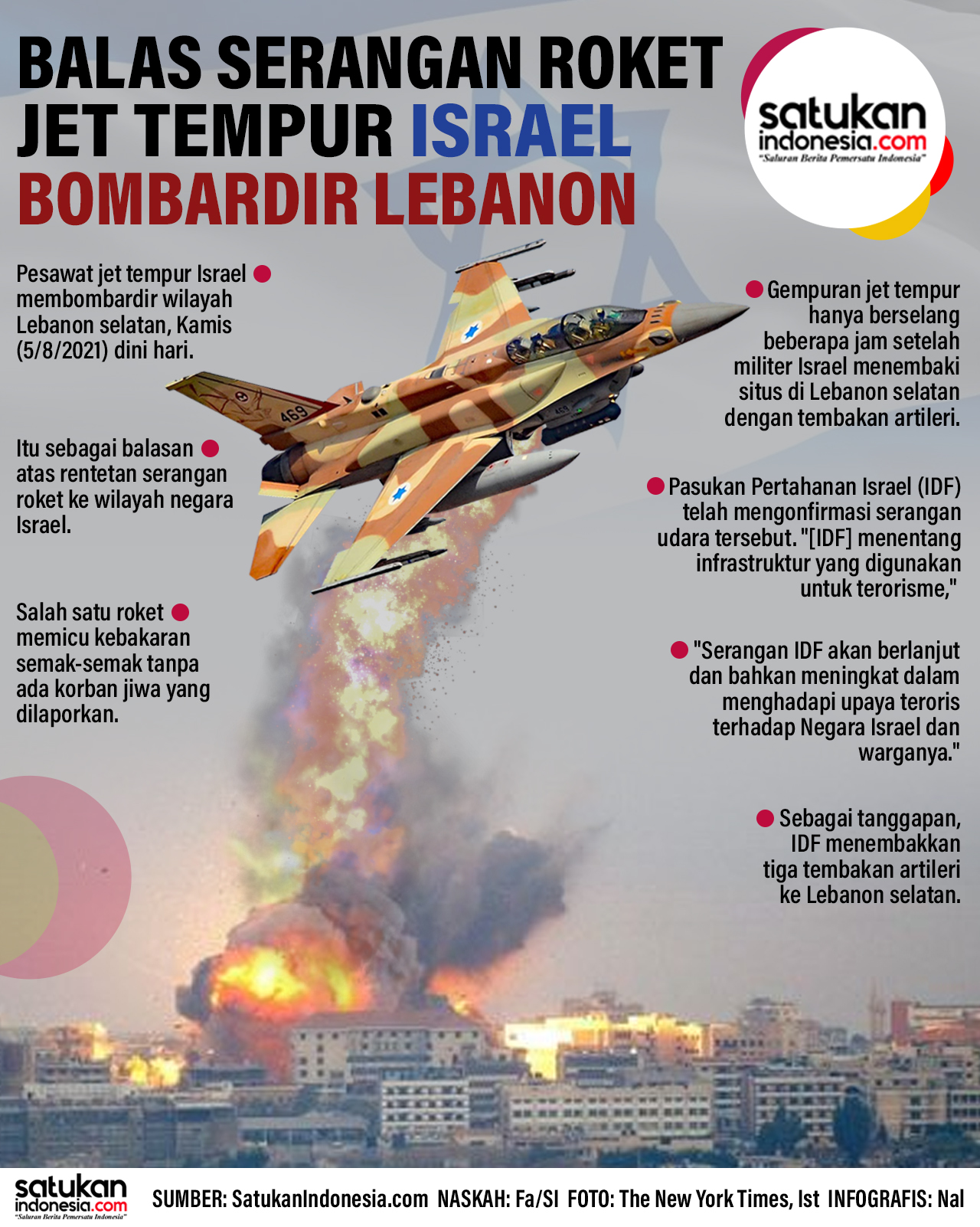 SatukanIndonesia.com – Pesawat jet tempur Israel membombardir wilayah Lebanon selatan, Kamis (5/8/2021) dini hari. Itu sebagai balasan atas serangan rentetan serangan roket ke wilayah negara Yahudi tersebut.