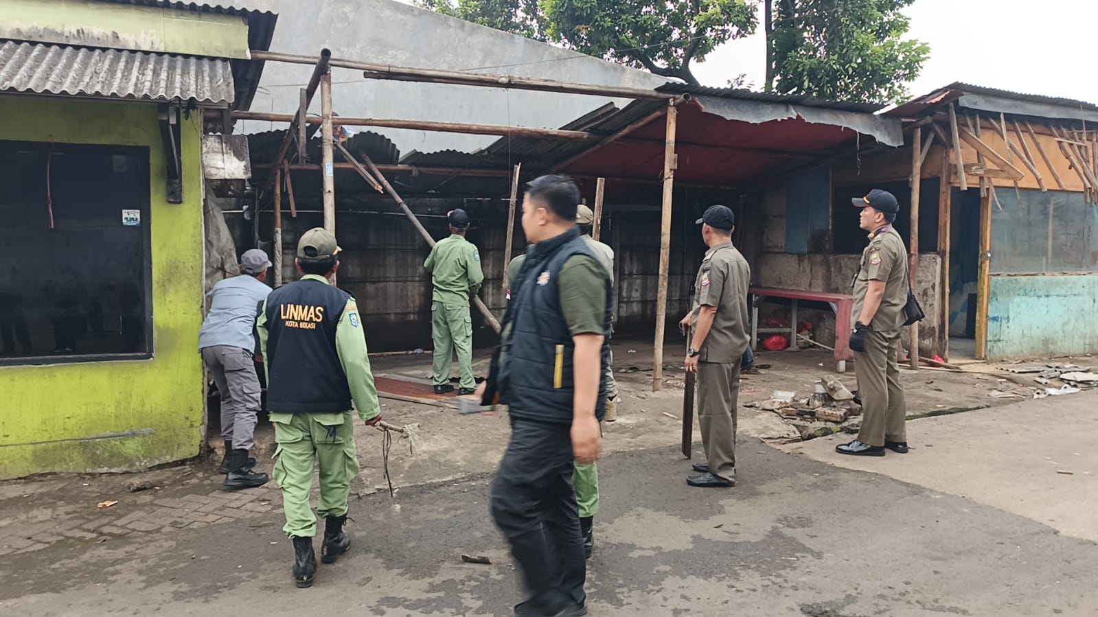 Penertiban dimulai pukul 10.00 WIB dan berlangsung hingga selesai dengan melibatkan berbagai unsur terkait. Kegiatan ini dipimpin langsung oleh Kasi Trantib Kecamatan Jatisampurna dan diikuti oleh personil gabungan, antara lain dari Satpol PP Kota Bekasi, aparat kelurahan, Babinsa TNI AD, Bhabinkamtibmas, serta perwakilan dari UPTD dan instansi terkait lainnya.