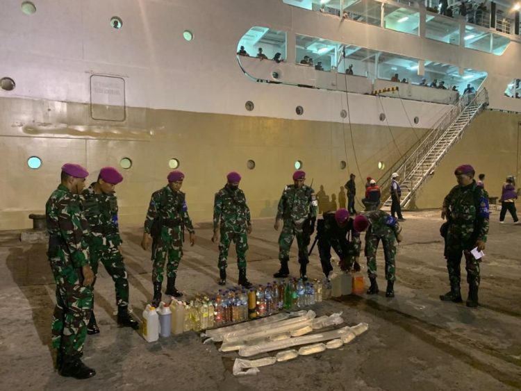 Jakarta, SatukanIndonesia.Com – Prajurit TNI Angkatan Laut (TNI AL) dalam hal ini Batalyon Marinir Pertahanan Pangkalan (Yonmarhanlan) IX Ambon yang bertugas dalam Tim Satgas Pelni Ambon berhasil mengamankan ratusan liter Minuman Keras (Miras) tradisional jenis Sopi tanpa izin dari para penumpang KM Ceremai di Pelabuhan Tulehu, Ambon, Maluku, Senin (01/01).