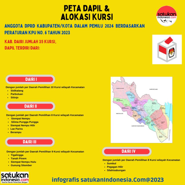 Jakarta, SatukanIndonesia.Com – Peta Dapil dan Alokasi Kursi Anggota DPRD Kabupaten/Kota pada pemilu 2024 dari Kabupaten Dairi berdasarkan peraturan KPU No.6 Tahun 2023.