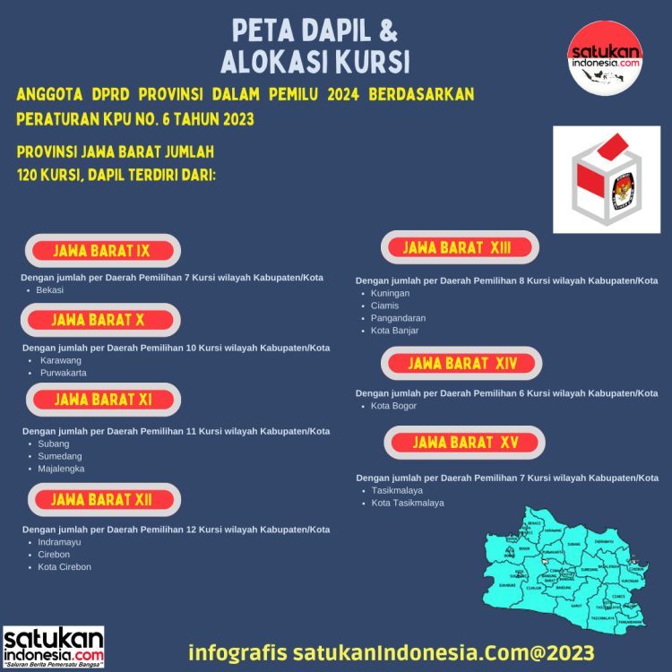 <img class="alignnone size-full wp-image-71949" src="https://www.satukanindonesia.com/wp-content/uploads/2023/03/WhatsApp-Image-2023-03-13-at-13.59.38-e1678691117387.jpeg" alt="" width="750" height="750" /> <img class="alignnone size-full wp-image-71950" src="https://www.satukanindonesia.com/wp-content/uploads/2023/03/WhatsApp-Image-2023-03-13-at-13.59.38-1-e1678691152374.jpeg" alt="" width="750" height="750" /> <strong>Jakarta, <a href="http://SatukanIndonesia.Com">SatukanIndonesia.Com</a></strong> - Peta Dapil dan Alokasi Kursi DPRD pada pemilu 2024 dari Provinsi jawa Barat berdasarkan peraturan KPU No.6 Tahun 2023.