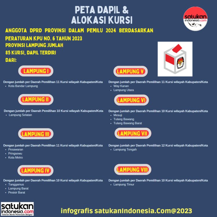 <strong><img class="alignnone size-full wp-image-70008" src="https://www.satukanindonesia.com/wp-content/uploads/2023/02/WhatsApp-Image-2023-02-16-at-11.23.20-e1676522697514.jpeg" alt="" width="750" height="750" />Jakarta, <a href="https://satukanindonesia.com/">SatukanIndonesia.Com</a></strong> – Peta Dapil dan Alokasi Kursi DPRD pada pemilu 2024 dari Provinsi Lampung berdasarkan peraturan KPU NO.6 Tahun 2023. <div id="quads-ad1" class="quads-location quads-ad1"></div> <div id="quads-ad3" class="quads-location quads-ad3"></div> <div class="jeg_ad jeg_ad_article jnews_content_inline_ads "> <div class="ads-wrapper align-center "></div> </div>