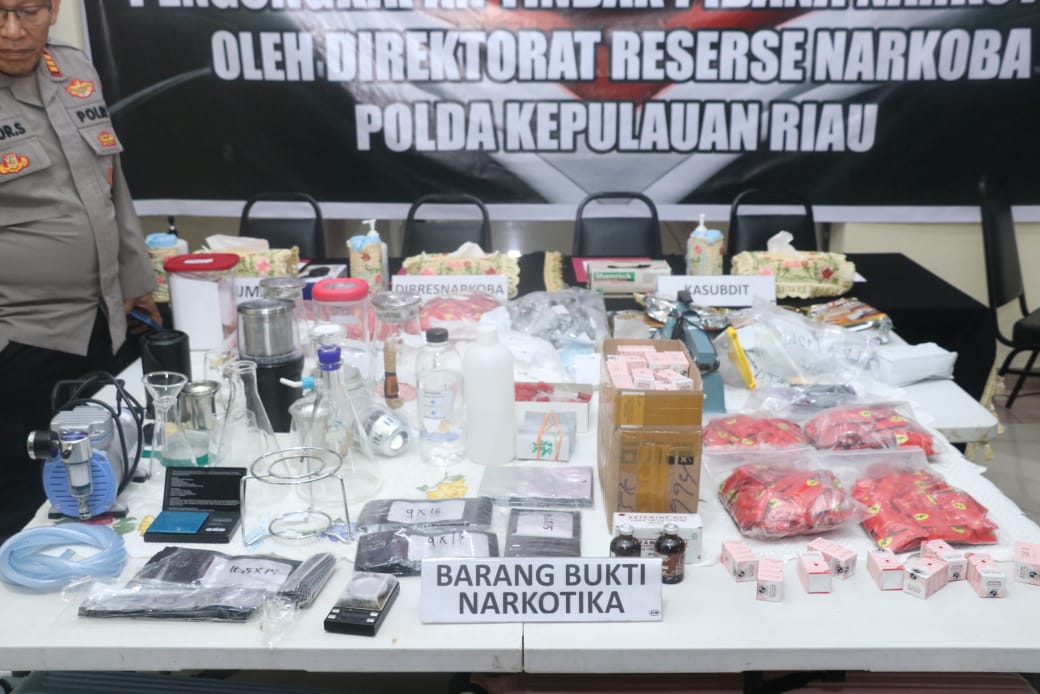 Dalam kesempatan tersebut, Dirresnarkoba Polda Kepri Kombes. Pol. Anggoro Wicaksono, S.H., S.I.K., M.H., menyampaikan bahwa Penggerebekan dilakukan pada 26 Mei 2025 berdasarkan Laporan Polisi yang pertama, dari dalam Kamar Apartemen di lantai 12, petugas menemukan 4.839 butir ekstasi berbagai warna dan merek, 3.266,45 gram serbuk ketamine dan 415 botol cairan ketamine HCL, 182,65 gram sabu, 405,8 gram happy water dan 454 butir happy five, 1.309 pcs liquid cair mengandung etomidate, ratusan alat laboratorium, kemasan, dan bahan produksi lainnya