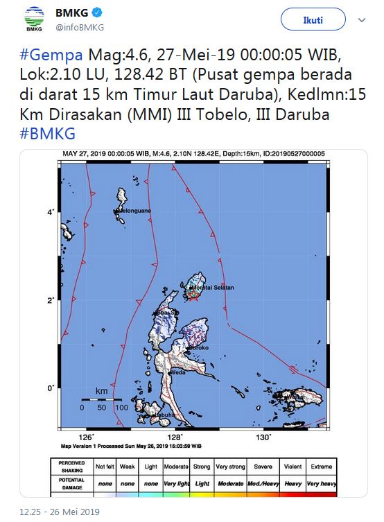 “Pusat gempa di darat 15 km Timur Laut Daruba, kedalaman 15 Km,” kicau BMG melalui akun Twitter-nya, Senin (27/05/19).