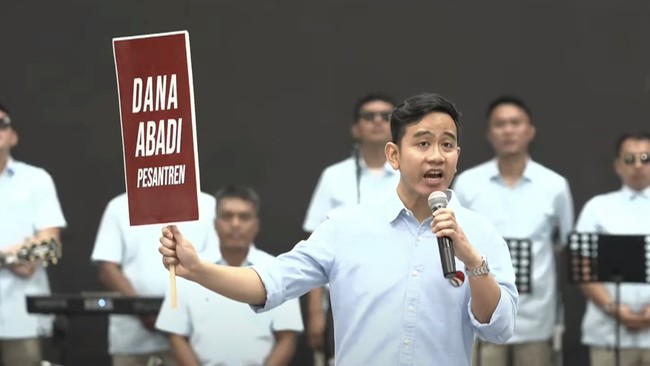 “Mohon izin Pak Prabowo, saya ingin membocorkan beberapa program unggulan, yaitu dana abadi pesantren,” kata Gibran di Indonesia Arena, GBK, Jakarta, sebagaimana dilansir CNN Indonesia.
