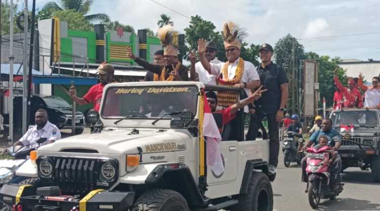 Pasangan calon bupati dan calon wakil bupati yakni Hermus Indou dan Mugiyono (HERO) di jemput ratusan masyarakat Manokwari di Bandar Udara Rendani Manokwari, Rabu (14/08/2024).