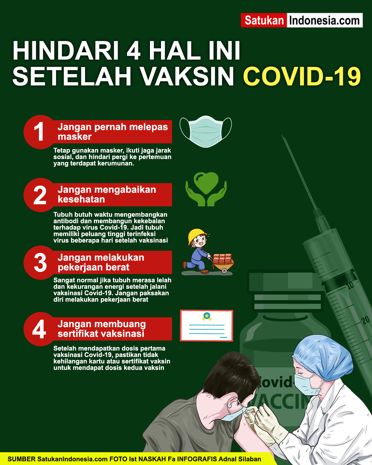 Jakarta, SatukanIndonesia.com – Percepatan program vaksinasi Covid-19 kepada masyarakat sedang diupayakan pemerintah agar Indonesia bisa mencapai herd immunity. Nah, bagi Anda yang baru saja divaksin, ada beberapa hal yang perlu dihindari.