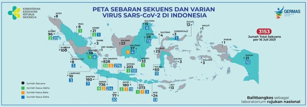 Menurut data Kementerian Kesehatan, per 16 Juli lalu, telah ditemukan 824 kasus dari varian yang diwaspadai (Variant of Concern) WHO yakni Delta, Alpha, dan Beta. Hasil ini didapat dari 3.153 sampel kasus yang dilakukan Whole Genome Sequencing (WGS) untuk memetakan varian corona.