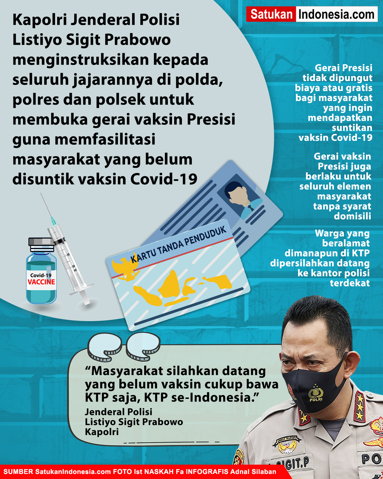 Jakarta, SatukanIndonesia.com – Kapolri Jenderal Polisi Listiyo Sigit Prabowo menginstruksikan kepada seluruh jajarannya di polda, polres, dan polsek untuk membuka gerai vaksin Presisi guna memfasilitasi masyarakat yang belum disuntik vaksin Covid-19.
