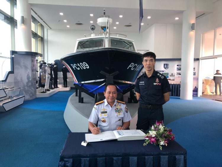 Komandan SPCG SAC Cheang Keng Keong menyambut kedatangan Laksdya TNI Dr. Aan Kurnia beserta rombongan di Brani, Markas SPCG.