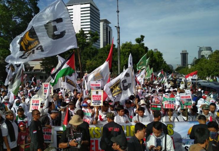 Sementara itu, melalui mobil komando, panitia aksi terus menyanyikan yel-yel tentang pembelaan Palestina sembari sesekali diselingi takbir.