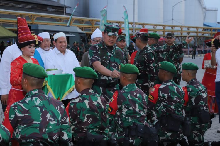 Belawan, SatukanIndonesia.Com – Panglima TNI Laksamana TNI Yudo Margono didampingi Pangdam I/BB Mayjen TNI A. Daniel Chardin, SE, M. Si memimpin upacara pemberangkatan 900 prajurit Batalyon Infanteri RK 115/ML dan Yonif 125/SMB. Pasukan tersebut akan melaksanakan Satgas dalam rangka operasi Pengamanan Perbatasan (Pamtas) RI-PNG Kewilayahan Papua selama 12 bulan.