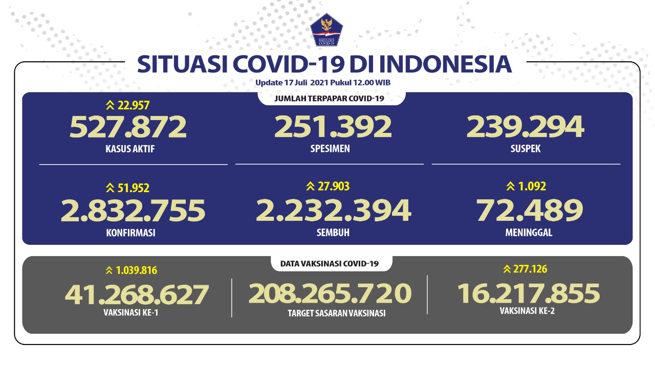 Jakarta, SatukanIndonesia.com – Perkembangan penanganan pandemi COVID-19 per 17 Juli 2021 secara nasional, angka kesembuhan harian terus bertambah sebesar 27.903 orang sembuh. Adanya penambahan hari ini meningkatkan angka kumulatif kesembuhan hingga melebihi angka 2,2 juta orang sembuh atau tepatnya 2.232.394 orang (79,8%).