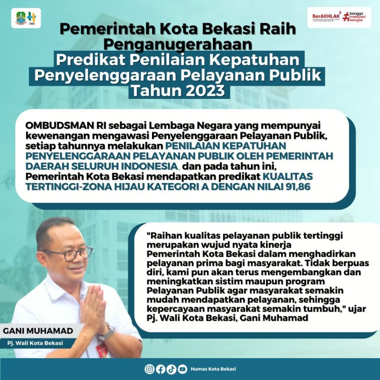 Kota Bekasi, SatukanIndonesia.Com – OMBUDSMAN RI sebagai Lembaga Negara yang mempunyai kewenangan mengawasi Penyelenggaraan Pelayanan Publik, setiap tahunnya melakukan Penilaian Kepatuhan Penyelenggaraan Pelayanan Publik oleh Pemerintah Daerah Seluruh Indonesia, dan pada tahun ini, Pemerintah Kota Bekasi mendapatkan predikat KUALITAS TERTINGGI-ZONA HIJAU KATEGORI A DENGAN NILAI 91,86.