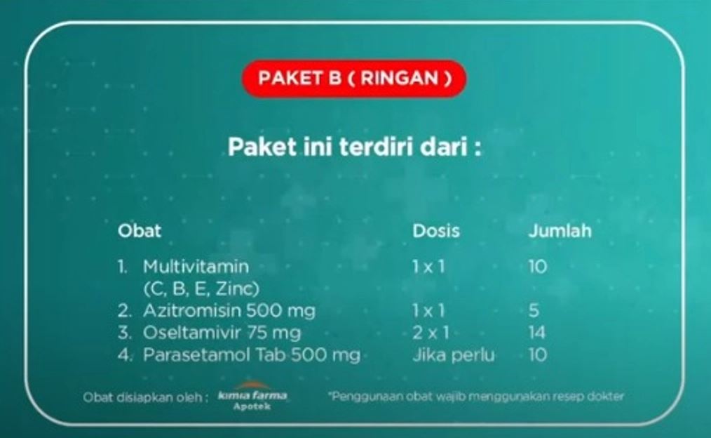 Namun sayangnya, paket A yang dimaksud itu tidak muncul di layar presentasi Menkes. Hanya ada obat-obatan pasien dengan gejala ringan yang terlihat.