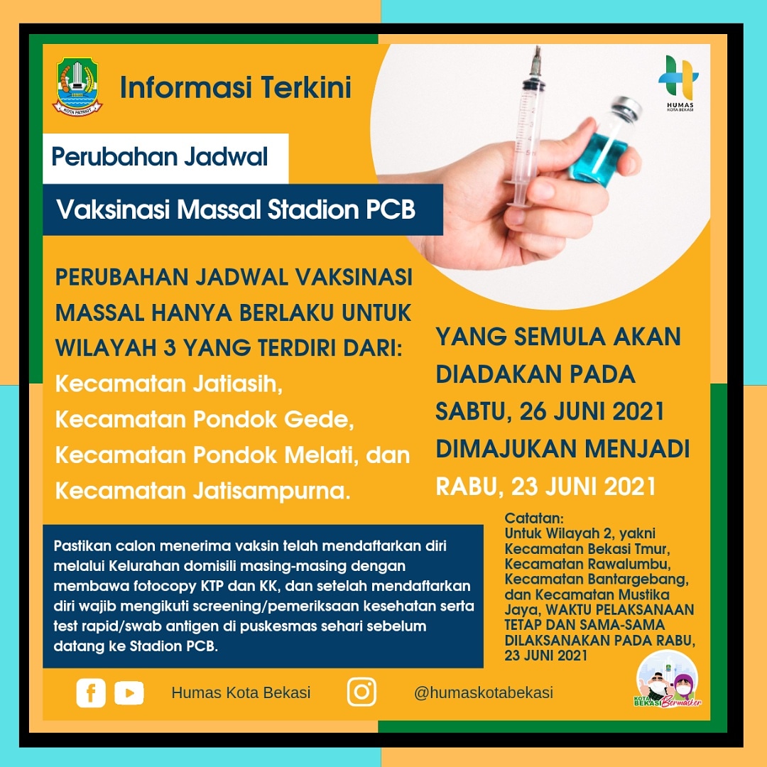 Seiring dengan hasil evaluasi kegiatan vaksinasi massal, Wali Kota Bekasi, Rahmat Effendi memutuskan untuk memajukan jadwal pelaksanaan vaksinasi massal untuk wilayah 3 yang semula dijadwalkan pada 26 Juni 2021 dimajukan menjadi tanggal 23 Juni 2021 untuk wilayah kecamatan Pondok Gede, Kecamatan Jatiasih, Kecamatan Pondok Melati, dan Kecamatan Jatisampurna.