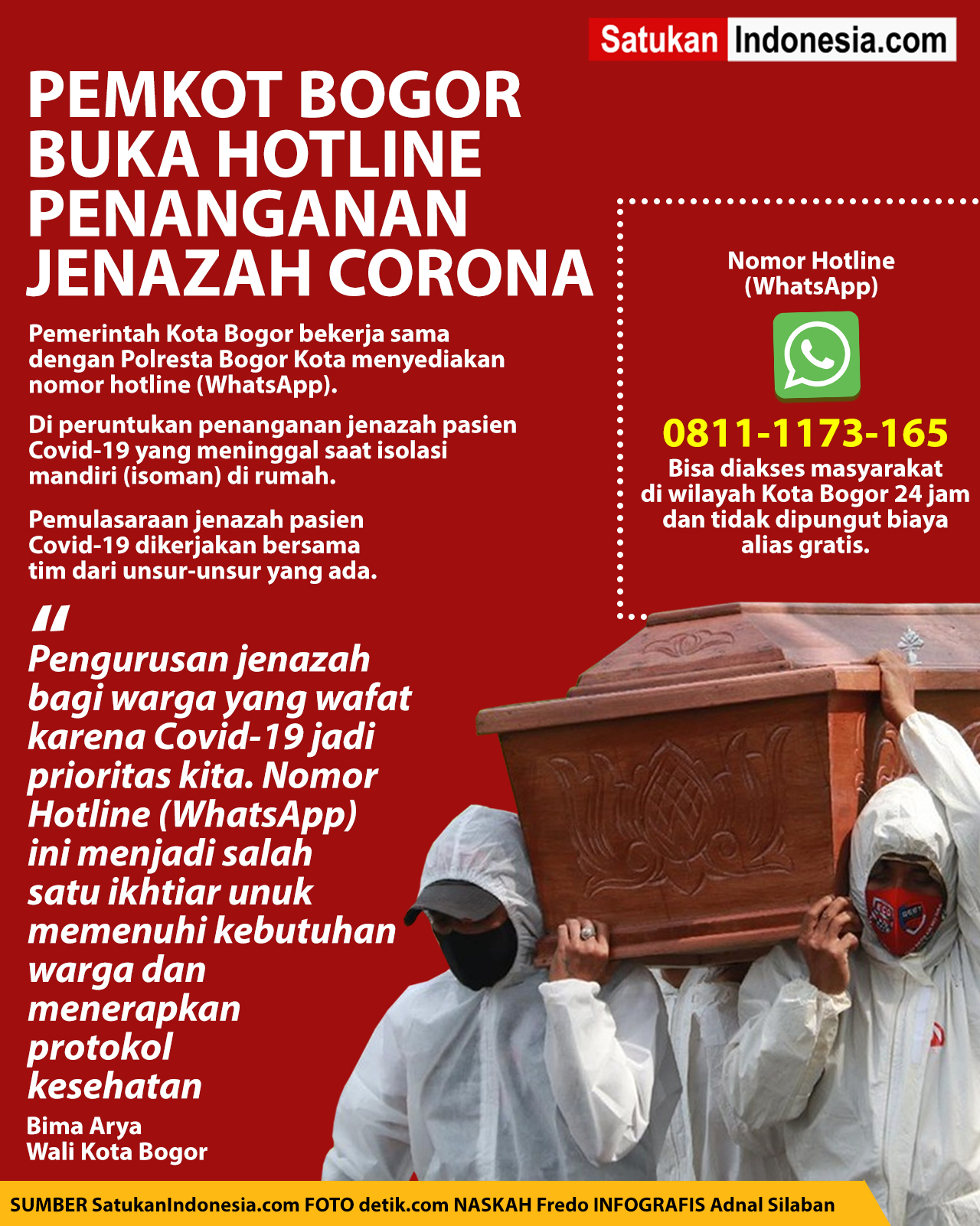 “Pengurusan jenazah bagi warga yang wafat karena Covid-19 jadi prioritas kita. Nomor Hotline (Whatsapp) ini menjadi salah satu ikhtiar untuk memenuhi kebutuhan warga dan menerapkan protokol kesehatan sesuai standar pemulasaraan jenazah pasien,” ujar Wali Kota Bogor, Bima Arya.