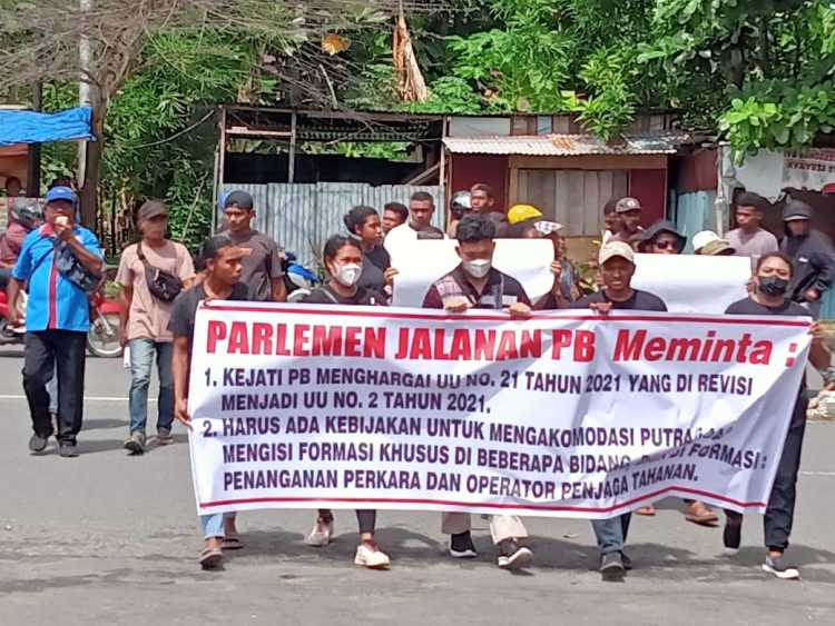 MANOKWARI, SatukanIndonesia.Com – Menanggapi hasil seleksi Afirmasi calon pegawai negeri sipil (CPNS) Kejaksaan, Kesatria Parlemen Jalanan (PARJAL) menggelar demostrasi damai di Kejaksaan Tinggi (Kejati) provinsi Papua Barat, Rabu (10/01/2024).