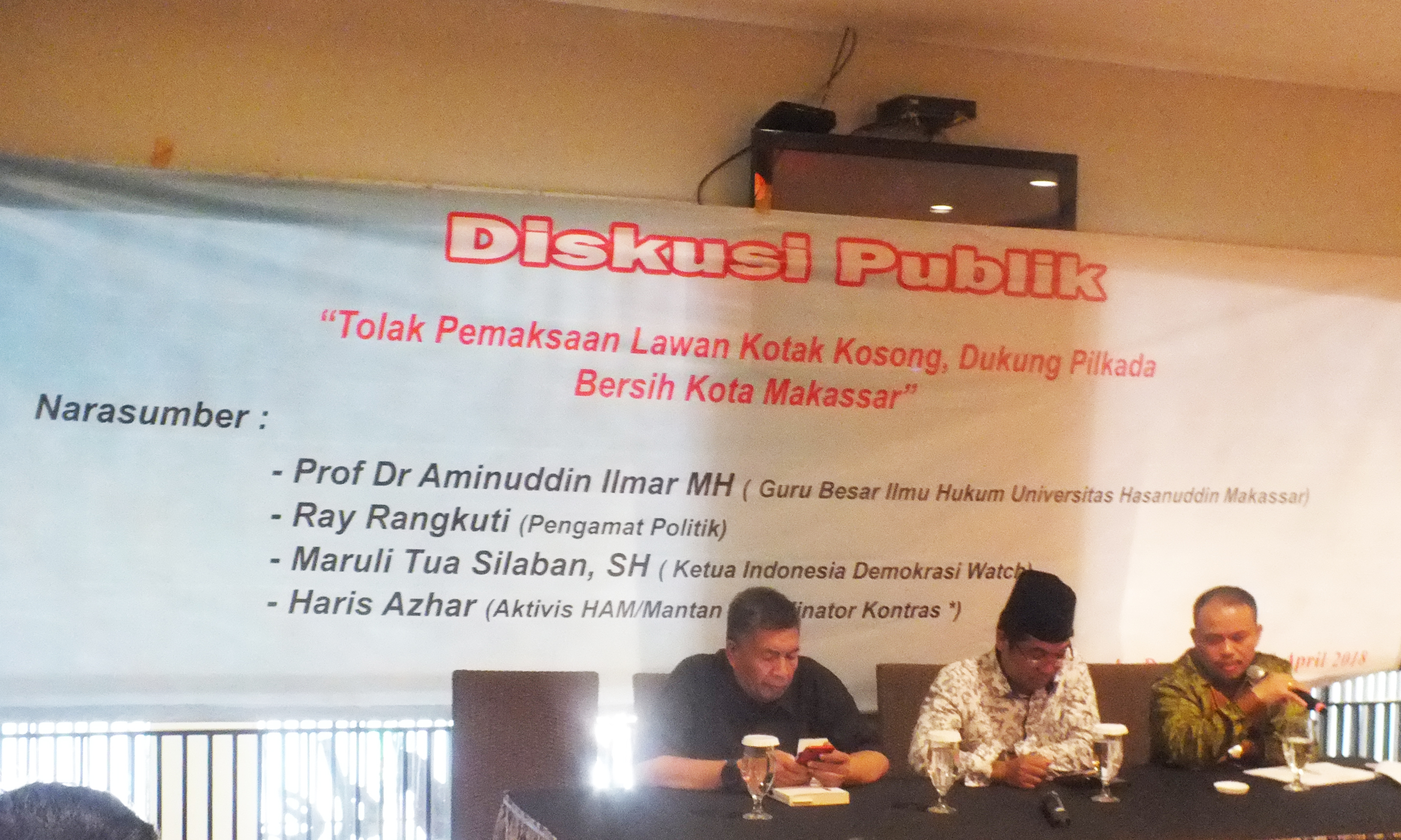 Hal tersebut disampaikan Maruli dalam Diskusi Publik “Tolak Pemaksaan Lawan Kotak Kosong, Dukung Pilkada Bersih Kota Makassar” yang digelar di Warung Bumbu Desa, Jakarta Pusat, Selasa (10/04/2018) minggu lalu. Turut hadir dalam Diskusi Publik ini Guru Besar Ilmu Hukum Universitas Hasanuddin Prof Aminudin Ilmar dan Pengamat Politik Ray Rangkuti.