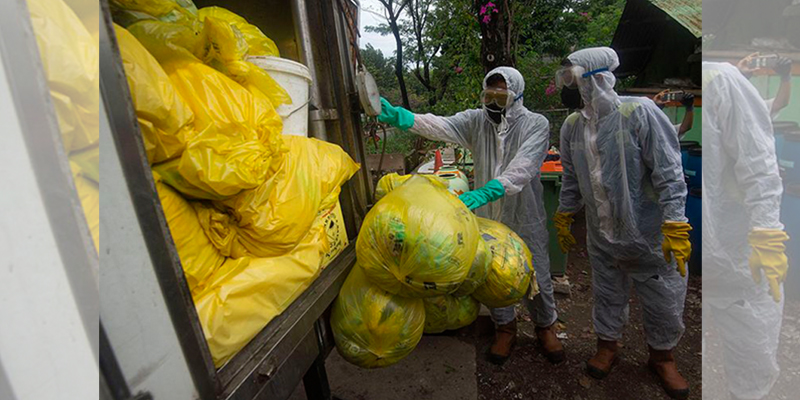 Sebelum dimusnahkan, petugas kebersihan memilah dan mengumpulkan limbah infeksius dari rumah tangga.