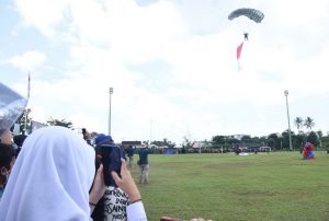 Jakarta, SatukanIndonesia.com — Pelaksanaan serbuan vaksinasi yang di selenggarakan TNI Angkatan Laut (TNI AL) di Dabo Singkep berbeda dengan serbuan vaksinasi sebelumnya, kali ini masyarakat Dabo Singkep di suguhi atraksi menarik dari prajurit TNI AL berupa demo pesawat udara Bonanza yang membentuk berbagai formasi dilanjutkan dengan 12 penerjun payung pasukan khusus dengan membawa 6 bendera yaitu bendera Merah Putih, bendera TNI AL, bendera Korps Marinir, bendera Koarmada I, bendera Lanal Dabo dan bendera Kabupaten Lingga bertempat di Lapangan Merdeka Dabo Singkep, Kepulauan Riau, Senin (25/10).
