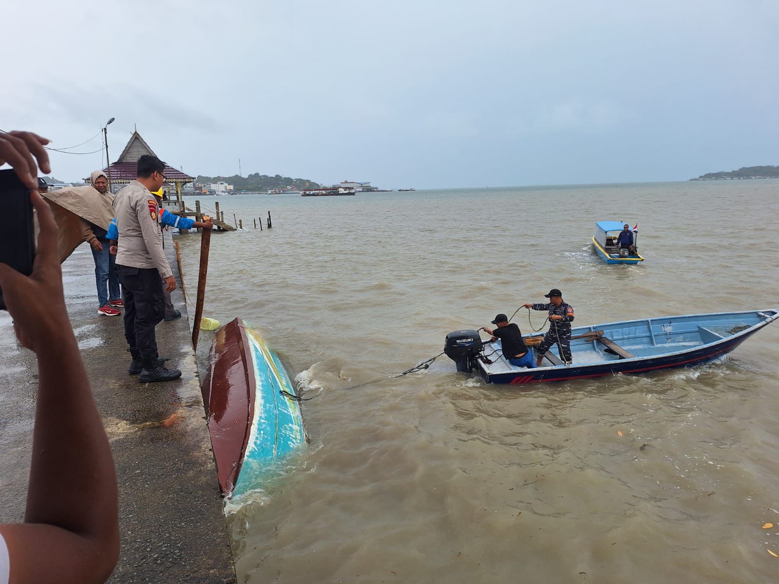 Mendapat laporan dari warga, Personel Pos TNI AL Senggarang langsung menuju lokasi kejadian untuk menyelamatkan seluruh penumpang dengan cara mengangkat satu persatu penumpang ke atas permukaan air.