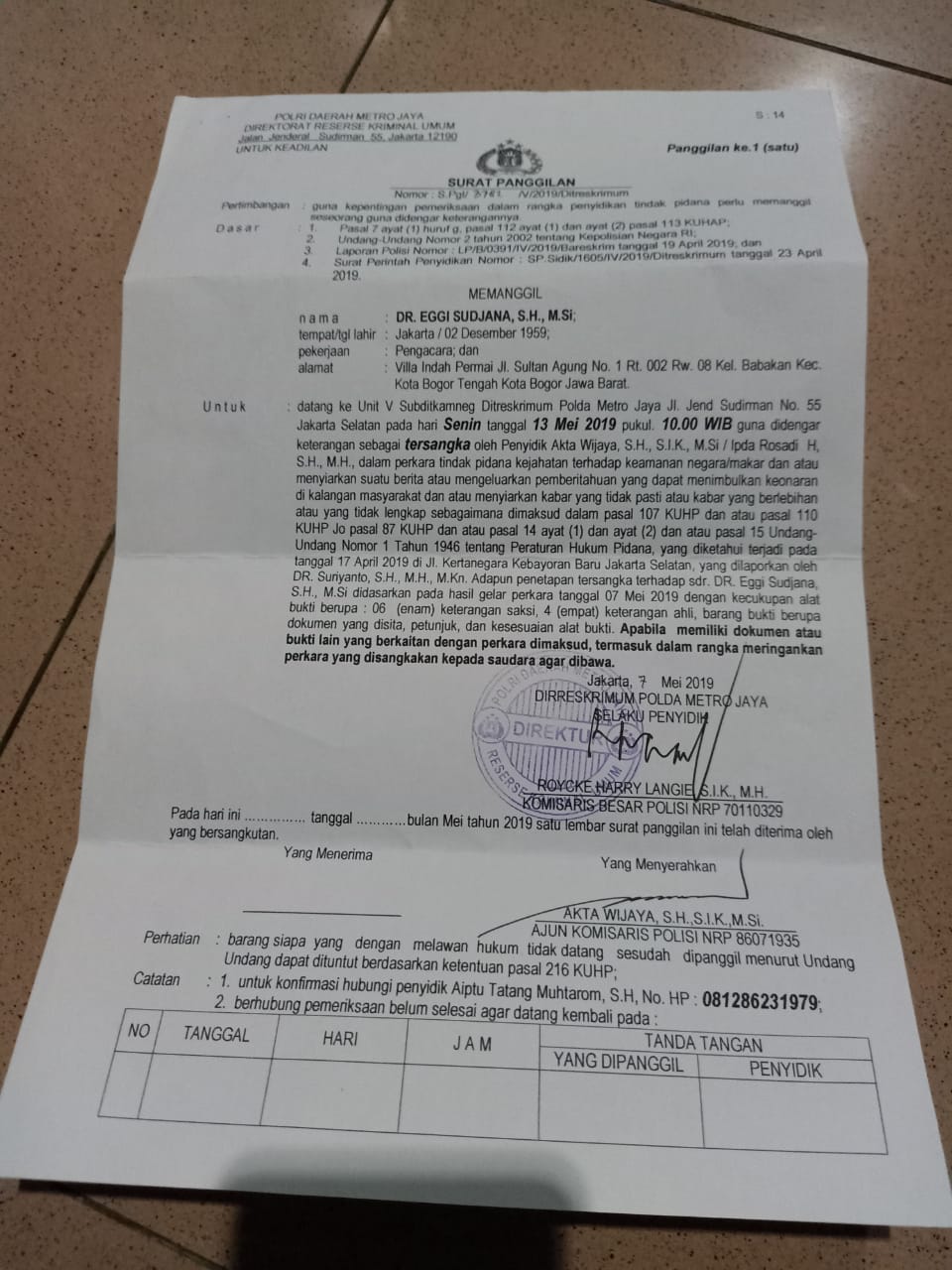 Surat tersebut, kata Eggi, adalah panggilan pemeriksaan dari penyidik Direktorat Reserse Kriminal Umum Polda Metro Jaya bernomor S.Pgl/3782/III/2019/Ditreskrimum. Eggi menyatakan dirinya diminta datang untuk diperiksa sebagai tersangka oleh penyidik pada 13 Mei 2019 pukul 10.00 WIB.