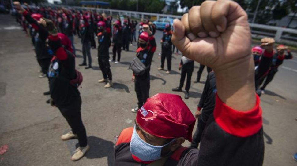 Ribuan massa buruh sudah berkumpul di area Patung Kuda sejak pukul 13.00 WIB. Mereka membawa sejumlah atribut aksi, seperti poster dan bendera.