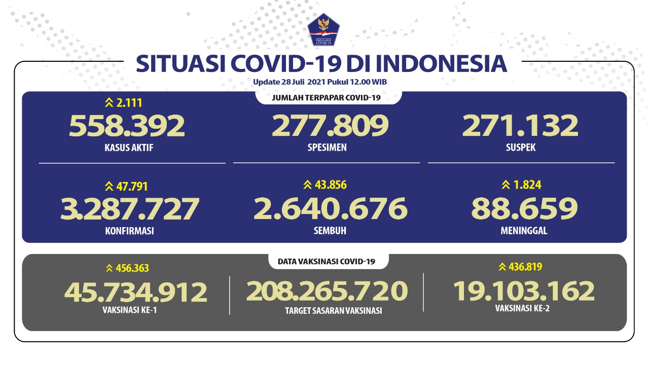 Jakarta, SatukanIndonesia.com – Per hari ini, Rabu (28/7/2021) terjadi penambahan sebanyak 47.791 kasus positif covid-19.